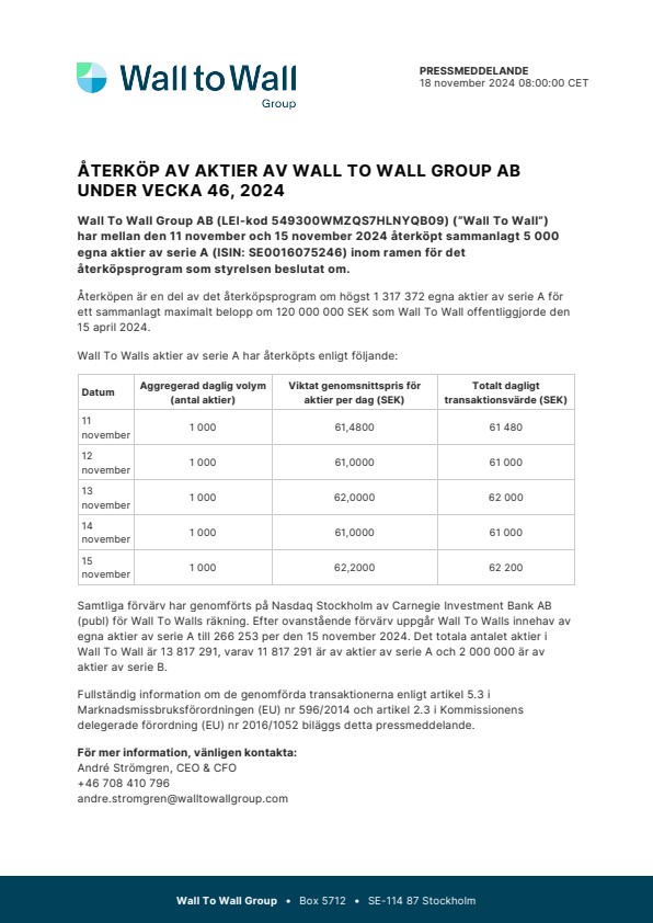 Samtliga förvärv har genomförts på Nasdaq Stockholm av Carnegie Investment Bank AB (publ) för Wall To Walls räkning. Efter ovanstående förvärv uppgår Wall To Walls innehav av egna aktier av serie A till 266 253 per den 15 november 2024. Det totala antalet aktier i Wall To Wall är 13 817 291, varav 11 817 291 är av aktier av serie A och 2 000 000 är av aktier av serie B.