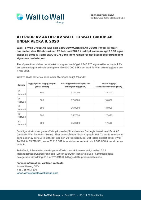 Wall To Wall Group AB (LEI-kod 549300WMZQS7HLNYQB09) (“Wall To Wall”) har mellan den 16 februari och 20 februari 2026 återköpt sammanlagt 2 500 egna aktier av serie A (ISIN: SE0016075246) inom ramen för det återköpsprogram som styrelsen beslutat om.