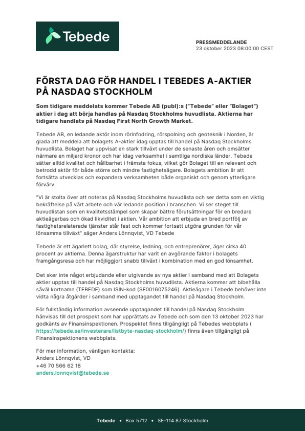 Tebede AB, en ledande aktör inom rörinfodring, rörspolning och geoteknik i Norden, är glada att meddela att bolagets A-aktier idag upptas till handel på Nasdaq Stockholms huvudlista. Bolaget har uppvisat en stark tillväxt under de senaste åren och omsätter närmare en miljard kronor och har idag verksamhet i samtliga nordiska länder. Tebede sätter alltid kvalitet och hållbarhet i främsta fokus, vilket gör Bolaget till en relevant och betrodd aktör för både större och mindre fastighetsägare. Bolagets ambition är att fortsätta utvecklas och expandera verksamheten både organiskt och genom ytterligare förvärv.
