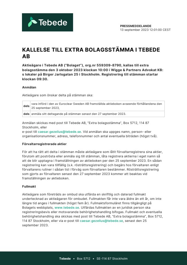 Aktieägare i Tebede AB (”Bolaget”), org.nr 559309-8790, kallas till extra bolagsstämma den 3 oktober 2023 klockan 10:00 i Wigge & Partners Advokat KB:s lokaler på Birger Jarlsgatan 25 i Stockholm. Registrering till stämman startar klockan 09:30.