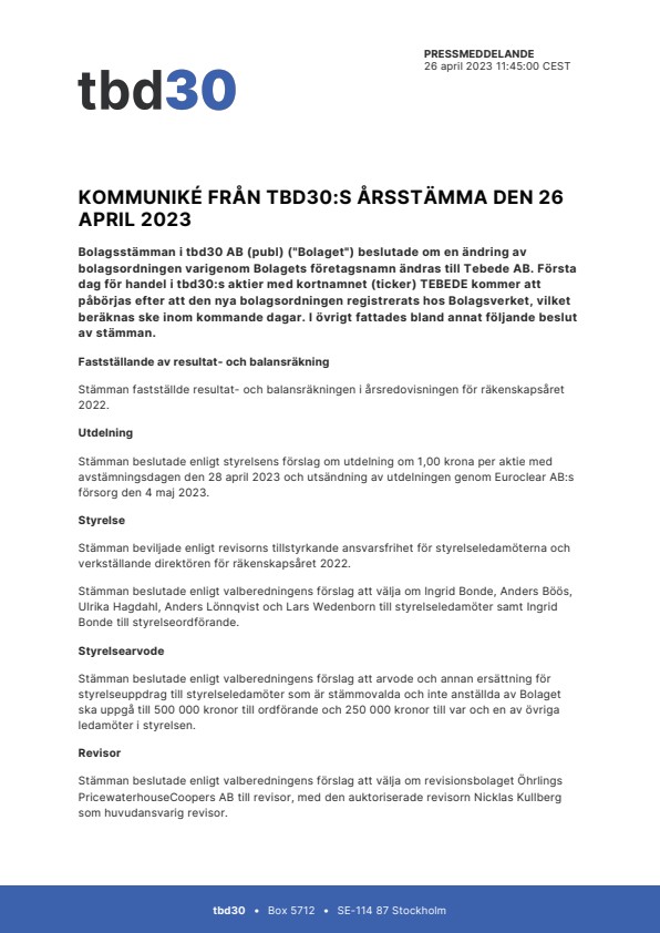 Bolagsstämman i tbd30 AB (publ) (”Bolaget”) beslutade om en ändring av bolagsordningen varigenom Bolagets företagsnamn ändras till Tebede AB. Första dag för handel i tbd30:s aktier med kortnamnet (ticker) TEBEDE kommer att påbörjas efter att den nya bolagsordningen registrerats hos Bolagsverket, vilket beräknas ske inom kommande dagar. I övrigt fattades bland annat följande beslut av stämman.