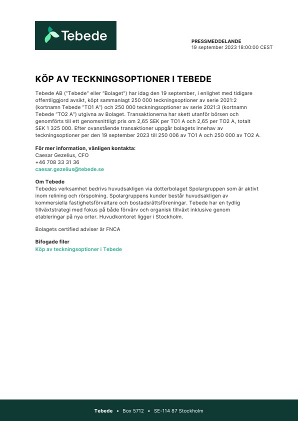 Tebede AB (”Tebede” eller ”Bolaget”) har idag den 19 september, i enlighet med tidigare offentliggjord avsikt, köpt sammanlagt 250 000 teckningsoptioner av serie 2021:2 (kortnamn Tebede ”TO1 A”) och 250 000 teckningsoptioner av serie 2021:3 (kortnamn Tebede ”TO2 A”) utgivna av Bolaget. Transaktionerna har skett utanför börsen och genomförts till ett genomsnittligt pris om 2,65 SEK per TO1 A och 2,65 per TO2 A, totalt SEK 1 325 000. Efter ovanstående transaktioner uppgår bolagets innehav av teckningsoptioner per den 19 september 2023 till 250 006 av TO1 A och 250 000 av TO2 A.