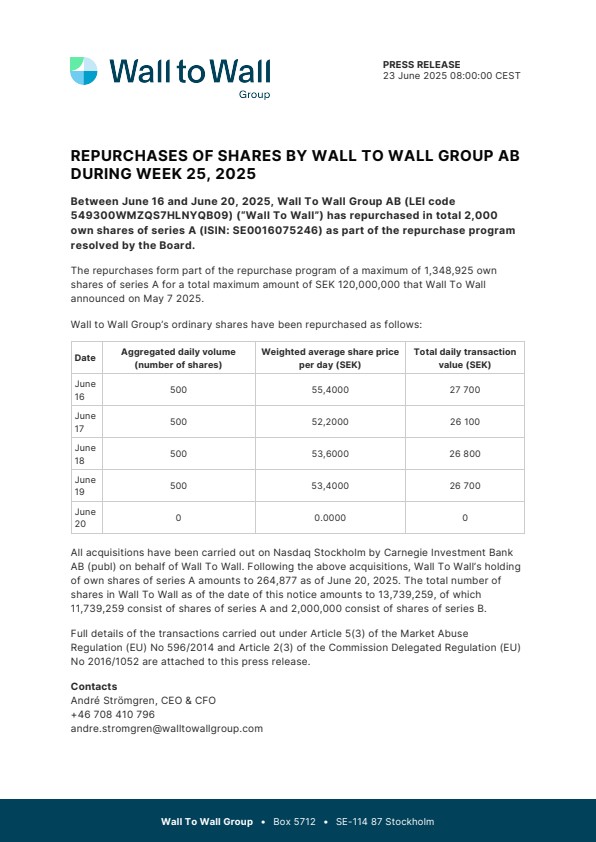 Between June 16 and June 20, 2025, Wall To Wall Group AB (LEI code 549300WMZQS7HLNYQB09) (“Wall To Wall”) has repurchased in total 2,000 own shares of series A (ISIN: SE0016075246) as part of the repurchase program resolved by the Board.