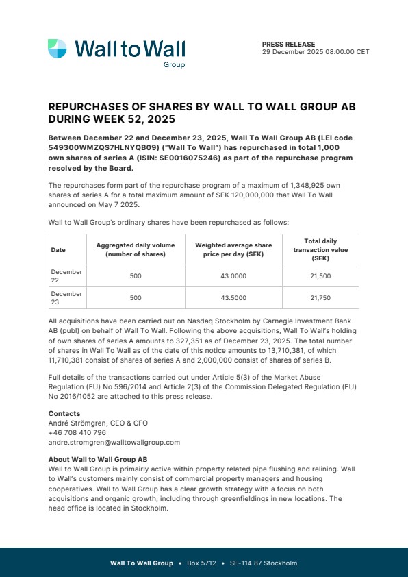 Between December 22 and December 23, 2025, Wall To Wall Group AB (LEI code 549300WMZQS7HLNYQB09) (“Wall To Wall”) has repurchased in total 1,000 own shares of series A (ISIN: SE0016075246) as part of the repurchase program resolved by the Board.
