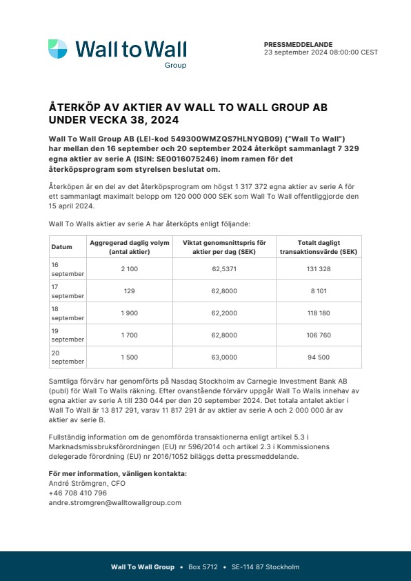 Samtliga förvärv har genomförts på Nasdaq Stockholm av Carnegie Investment Bank AB (publ) för Wall To Walls räkning. Efter ovanstående förvärv uppgår Wall To Walls innehav av egna aktier av serie A till 230 044 per den 20 september 2024. Det totala antalet aktier i Wall To Wall är 13 817 291, varav 11 817 291 är av aktier av serie A och 2 000 000 är av aktier av serie B.