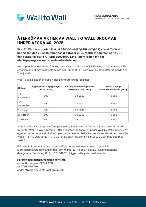 Wall To Wall Group AB (LEI-kod 549300WMZQS7HLNYQB09) (“Wall To Wall”) har mellan den 29 september och 3 oktober 2025 återköpt sammanlagt 2 500 egna aktier av serie A (ISIN: SE0016075246) inom ramen för det återköpsprogram som styrelsen beslutat om.