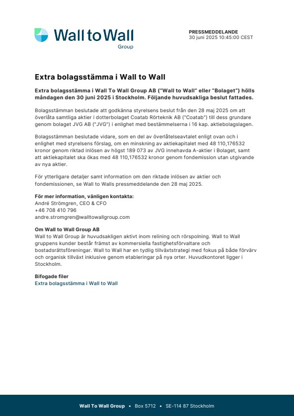 Extra bolagsstämma i Wall To Wall Group AB (”Wall to Wall” eller ”Bolaget”) hölls måndagen den 30 juni 2025 i Stockholm. Följande huvudsakliga beslut fattades.