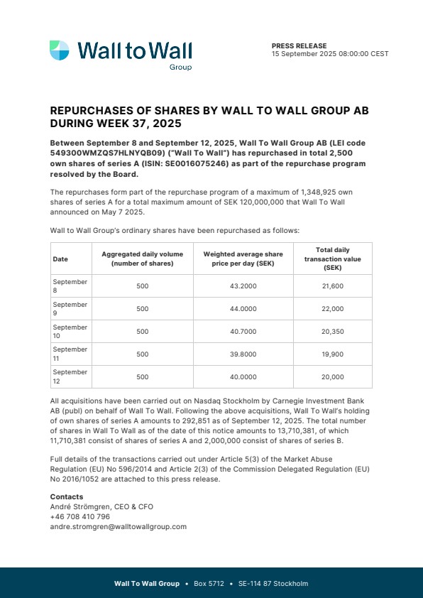 Between September 8 and September 12, 2025, Wall To Wall Group AB (LEI code 549300WMZQS7HLNYQB09) (“Wall To Wall”) has repurchased in total 2,500 own shares of series A (ISIN: SE0016075246) as part of the repurchase program resolved by the Board.