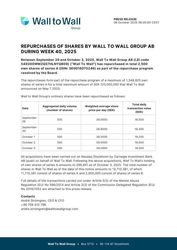 Between September 29 and October 3, 2025, Wall To Wall Group AB (LEI code 549300WMZQS7HLNYQB09) (“Wall To Wall”) has repurchased in total 2,500 own shares of series A (ISIN: SE0016075246) as part of the repurchase program resolved by the Board.