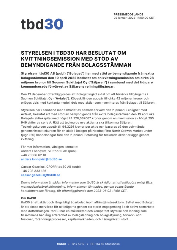 Styrelsen i tbd30 AB (publ) (”Bolaget”) har med stöd av bemyndigande från extra bolagsstämman den 19 april 2022 beslutat om en kvittningsemission om cirka 28 miljoner kronor till Suomen Sukittajat Oy (”Säljaren”) i samband med det tidigare kommunicerade förvärvet av Säljarens reliningtillgångar.