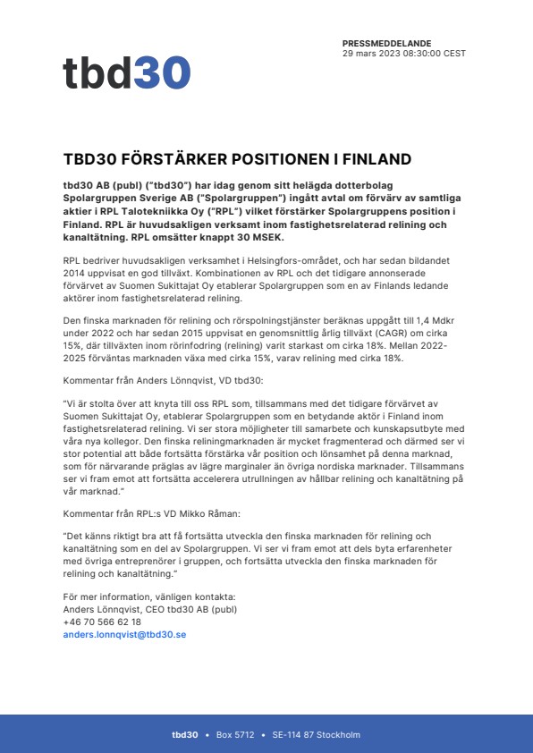 tbd30 AB (publ) (”tbd30”) har idag genom sitt helägda dotterbolag Spolargruppen Sverige AB (”Spolargruppen”) ingått avtal om förvärv av samtliga aktier i RPL Talotekniikka Oy (”RPL”) vilket förstärker Spolargruppens position i Finland. RPL är huvudsakligen verksamt inom fastighetsrelaterad relining och kanaltätning. RPL omsätter knappt 30 MSEK.