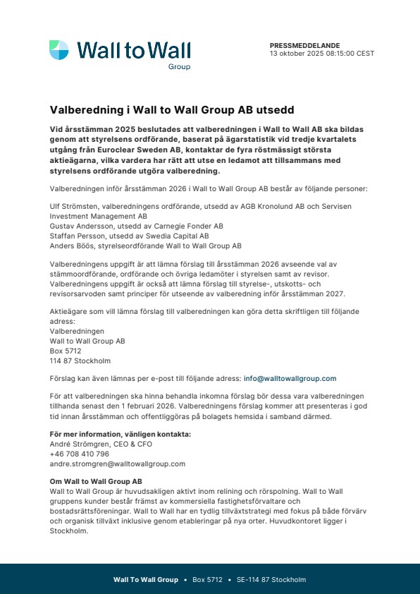 Vid årsstämman 2025 beslutades att valberedningen i Wall to Wall AB ska bildas genom att styrelsens ordförande, baserat på ägarstatistik vid tredje kvartalets utgång från Euroclear Sweden AB, kontaktar de fyra röstmässigt största aktieägarna, vilka vardera har rätt att utse en ledamot att tillsammans med styrelsens ordförande utgöra valberedning.