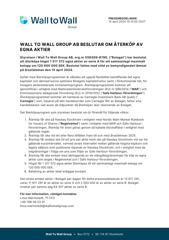 Styrelsen i Wall To Wall Group AB, org.nr 559309-8790, (”Bolaget”) har beslutat att återköpa högst 1 317 372 egna aktier av serie A för ett sammanlagt maximalt belopp om 120 000 000 SEK. Beslutet fattas med stöd av bemyndigandet lämnat på årsstämman den 15 april 2024.